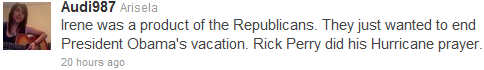 I think the first tweet is being misrepresented in this article. The tweeter is trying to say that Hurricane Irene is creating an economic emergency just like Republicans did when they were voted into office. He is not blaming the hurricane on Republicans, however, he should probably realize that there was an economic emergency before Republicans were voted in...